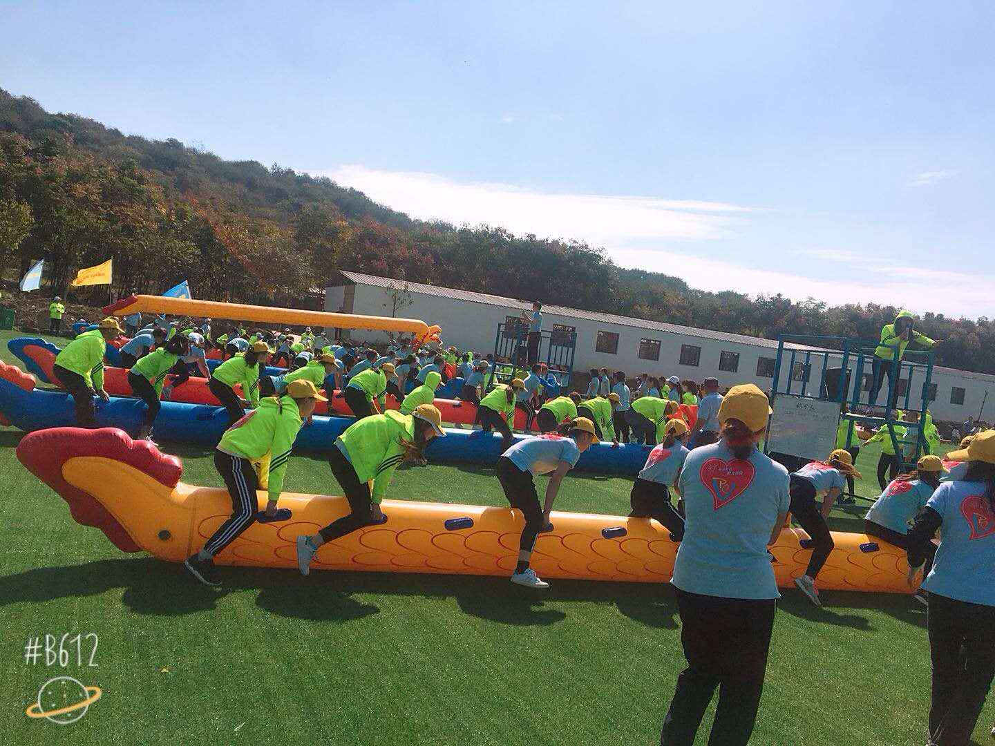 这两个项目对体力要求都不大,后面的旱地龙舟比赛真的是很壮观啊。每个团队分成AB两个小组,以终点接力的形式开展。十几个人驾驭一条大号充气龙,嘴里喊着左右、一二等不同的团队节奏口号,一路“风尘仆仆”,就是为了给B对的小组争取时间和优势,尤其是掉头的时候,场面感真的很强啊,返程的过程更是紧张,有的名次之间相差不过几秒钟,可是比赛就是如此,差之毫厘结果就不一样了。